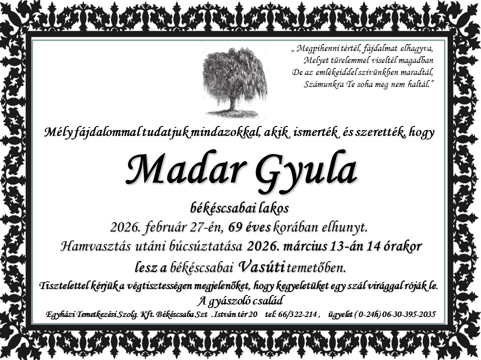 5600 Békéscsaba, Szent István tér 20. Ügyeleti telefon: 30/395-2035 Telefon: 66/322-214 temetkezes5600@gmail.com