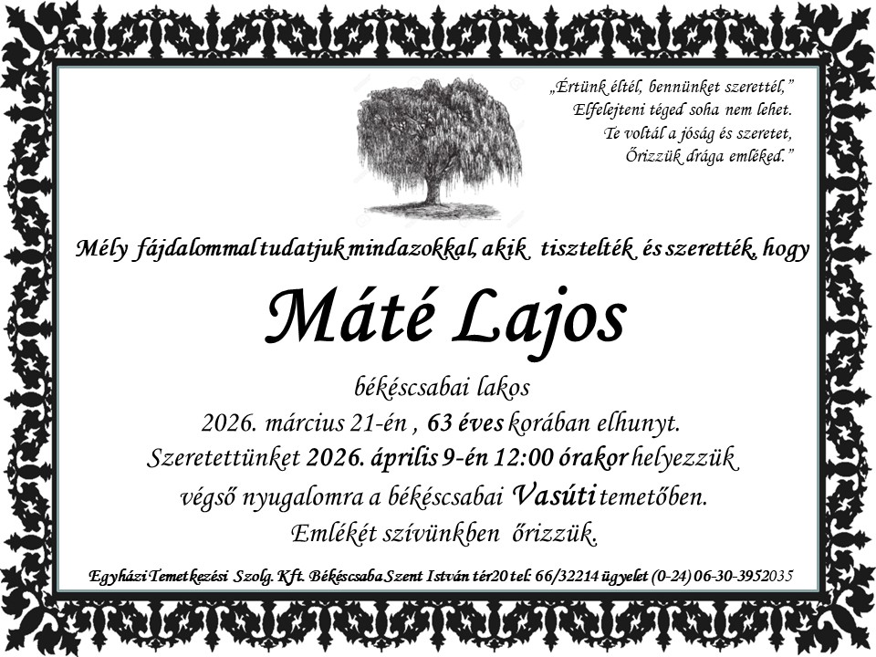 5600 Békéscsaba, Szent István tér 20. Ügyeleti telefon: 30/395-2035 Telefon: 66/322-214 temetkezes5600@gmail.com