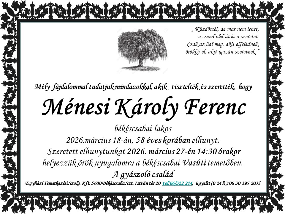 5600 Békéscsaba, Szent István tér 20. Ügyeleti telefon: 30/395-2035 Telefon: 66/322-214 temetkezes5600@gmail.com